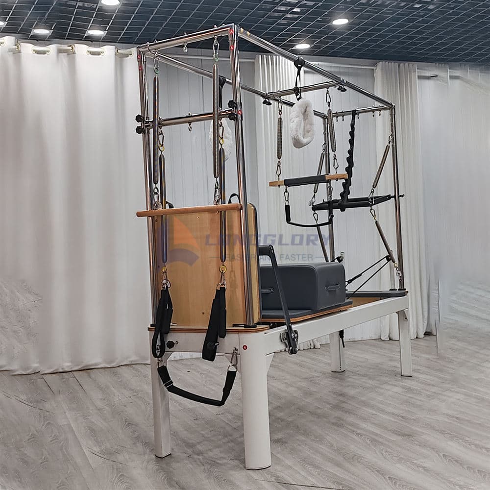 Erabilera komertzialerako edo praktika pribaturako, Aluminium Three in One Pilates Cadillac Reformer-ek errendimendu profesionala, prestakuntza-funtzio polifazetikoak eta gorputz osoko girotzeko eta Pilates terapiarako egitura iraunkorra eskaintzen ditu.