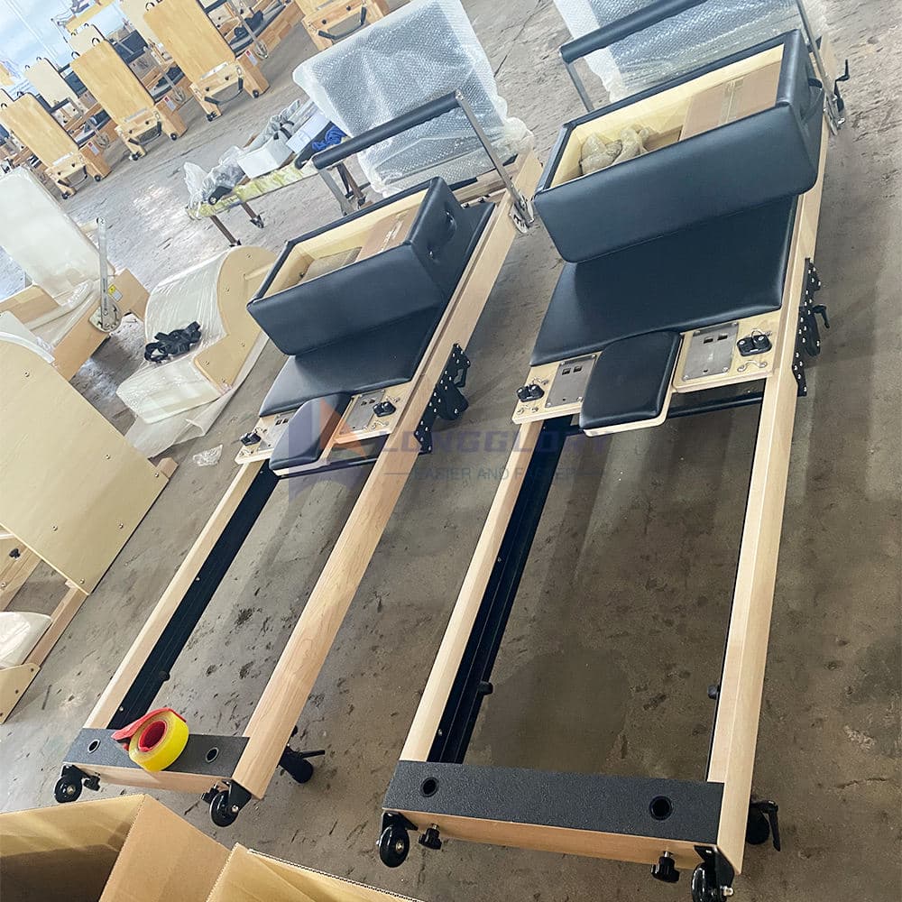 Yoga estudioetarako, Pilates estudioetarako, errehabilitazio zentroetarako, boutique-gimnasioetarako, hoteletarako eta etxeko ongizaterako geletarako eraikia, Yoga Maple Wood Folding Pilates Reformer-ek merkataritza-mailako errendimendua eskaintzen du diseinu trinko eta tolesgarri batean. Zehaztasun-errailak, marko sendotuak eta uhal iraunkorrak mugimendu leuna eta egonkortasuna bermatzen dute ariketa guztietan.